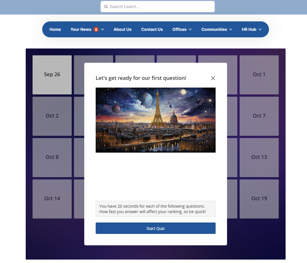 Diffusez la joie des fêtes en lançant un calendrier de quiz amusant et engageant pour susciter l'enthousiasme dans votre organisation. Favorisez un sentiment de communauté pendant une période spécifique et connectez les équipes avec des questions et des compétitions quotidiennes. Motivez les visites répétées sur votre plateforme avec des classements et récompensez la participation avec des prix. Ce cas d'utilisation vous aidera à concentrer l'attention sur votre intranet ou appli collaborateurs, de manière passionnante et ludique.